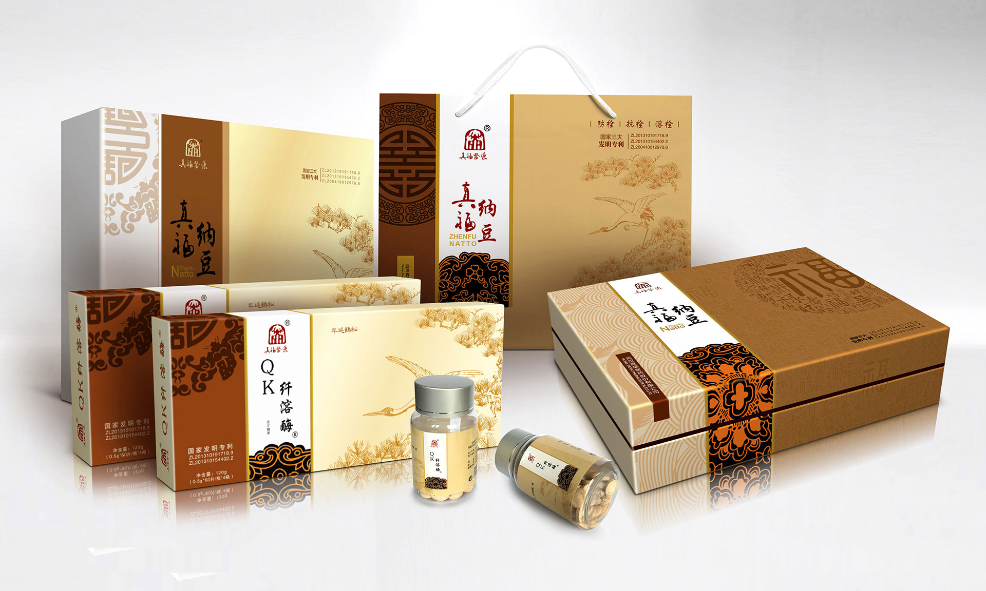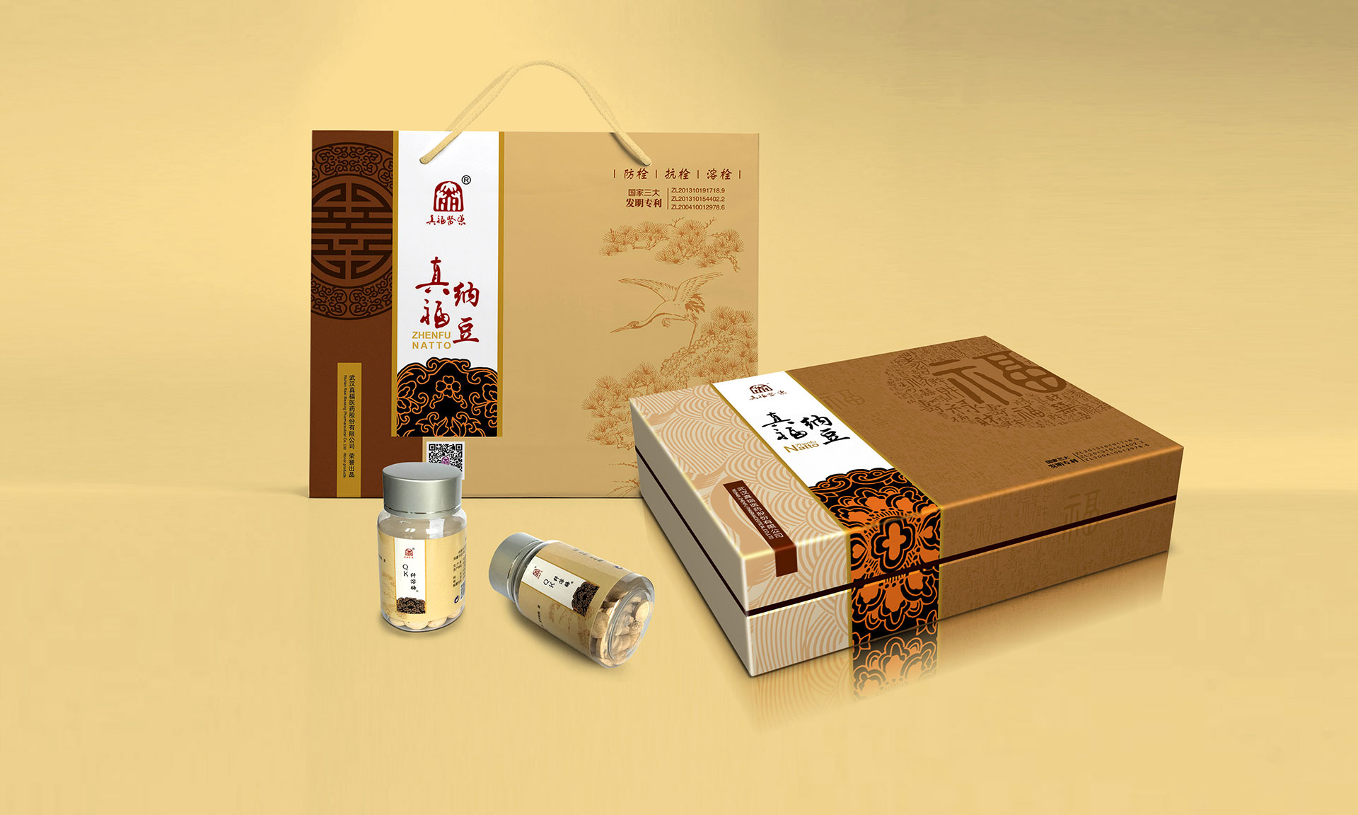 心腦血管疾病是人類健康的頭號殺手,中國人的死亡80%就是心腦管疾病。武漢大學(xué)生命科學(xué)院通過現(xiàn)代生物技術(shù),在農(nóng)產(chǎn)品大豆中提煉出枯草桿菌研制成的真福納豆,獲得國家三項發(fā)明專利。該產(chǎn)品對緩解和輔助治療心腦血管疾病有著顯著的效果,同時不對人產(chǎn)生任何傷害。是一種綠色健康的產(chǎn)品。信立浩達(dá)設(shè)計團(tuán)隊對產(chǎn)品價值深度挖掘,在產(chǎn)品包裝設(shè)計上用中國傳統(tǒng)的“福祿壽禧、松鶴延年”文化來表達(dá),同時反復(fù)訴求:讓中國人多活十年!這樣產(chǎn)品的價值,通過福壽文化、松鶴文化得到了形象的傳遞,深受中老年人的心理認(rèn)同。