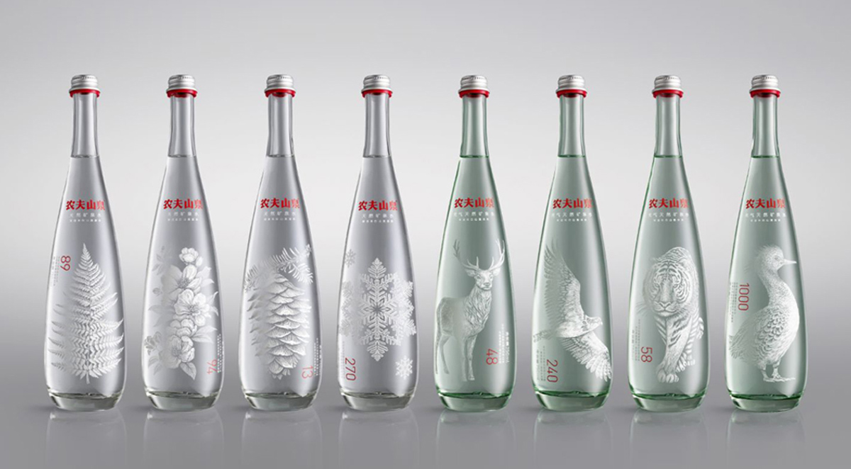 例如:農夫山泉推出的高端水,在水的包裝上,農夫山泉也彰顯了高逼格定位,由英國一個名為“Horse設計室”的設計公司設計,細長的玻璃瓶身,線條極為流暢,而瓶身包裝是8種長白山生態文化,彰顯了濃郁的自然人文氣質。據了解,讓產品回歸自然,向自然生態致敬是本次產品在生產設計中所傳達出的人文理念。